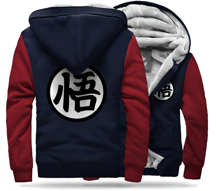 La couleur bleue, dominante sur le corps de la veste, fait écho à la tenue classique du personnage. Les manches d'un rouge saisissant, tel un feu combattif, rappellent la puissance de ses techniques les plus emblématiques, une invitation à embrasser son propre potentiel et à l'exprimer avec force. Le Kanji "Go" est reproduit avec soin, dans le respect de sa forme originelle, faisant de cette veste un véritable hommage.